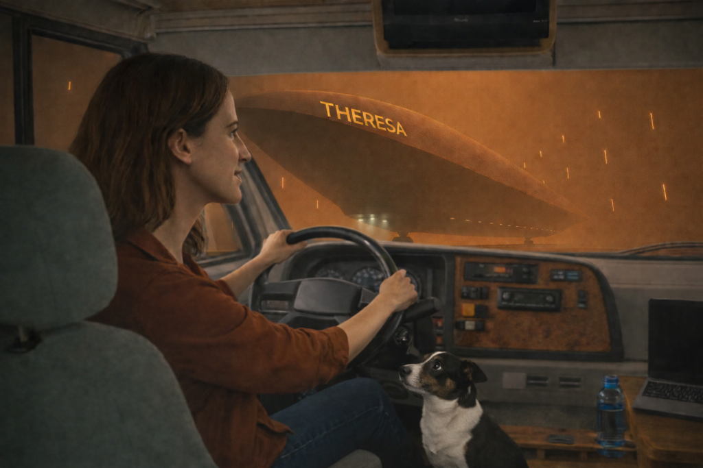 Ihre Augen sind müde, aber wachsam. Sie wirft einen kurzen unruhigen Blick in den Rückspiegel. Sie schaut GHZ ihren kleinen Hund an ihrer Seite an.