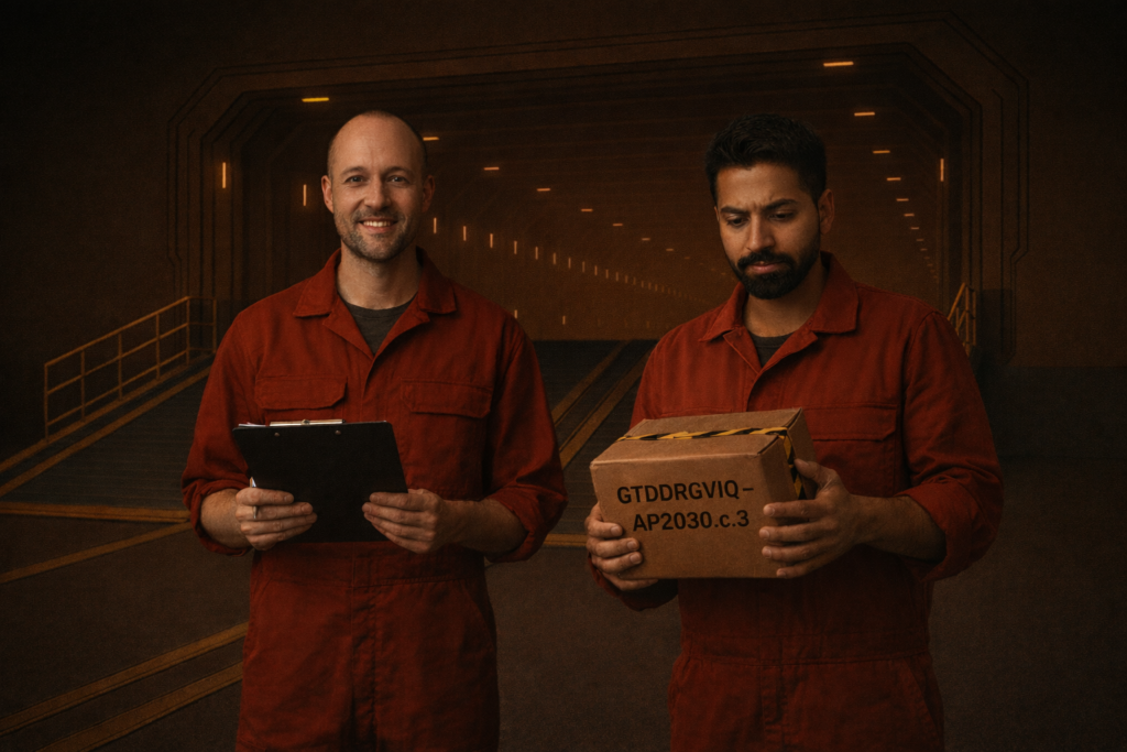 Ein junger Systemer, Marcel, aus der Crew, er trägt den Overall der Crew, tritt ins Bild und scant Typos Zugangskarte:
